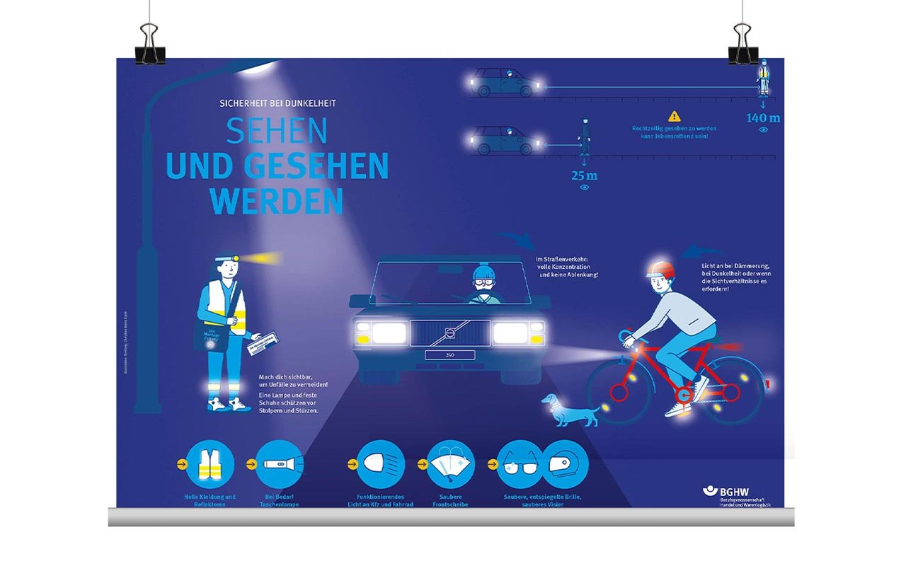Het dragen van lichtgekleurde kleding of opvallende kleuren zoals geel of oranje en het gebruik van extra reflectoren wordt gezien vanaf een afstand van 140 meter. Deze ogenschijnlijk kleine maatregel kan in geval van nood levensreddend zijn! Dit geldt vooral voor mensen die regelmatig in het donker werken, zoals krantenbezorgers of koeriers.